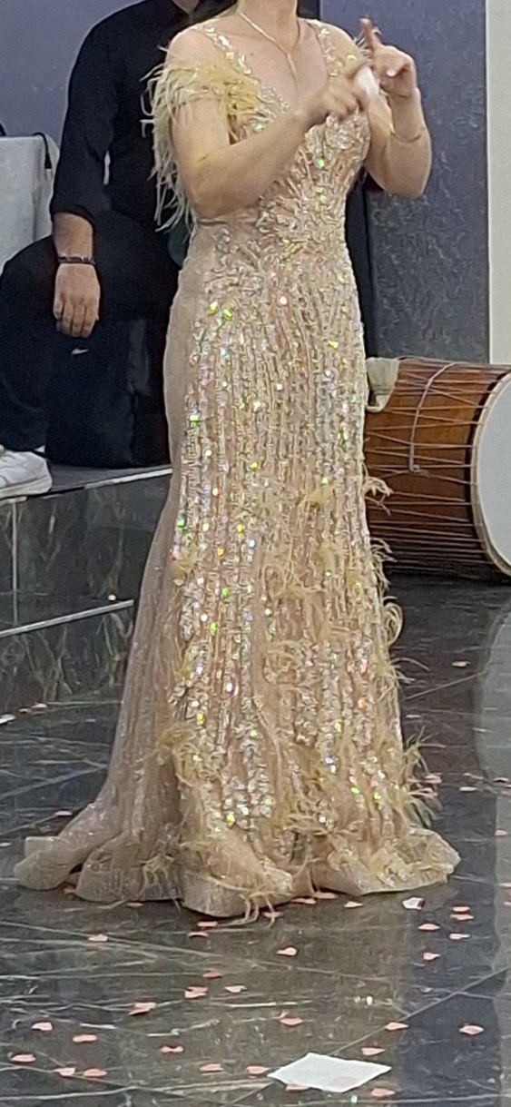 Parıltılı altın rengi, işlemeli ve payetli uzun abiye elbise. V yaka ve kolsuz, modern klasik kesimle şık bir görünüm sunar. 8 agustosta bir kere giyildi.Kuru temizleme yapıldı.