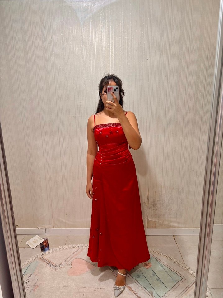 Parıltılı kırmızı, straplez yaka ve askılı kollara sahip, drapeli, klasik şıklıkta saten uzun elbise. Düğün nişan ve özel günler için ideal . Çok şık bir elbise.