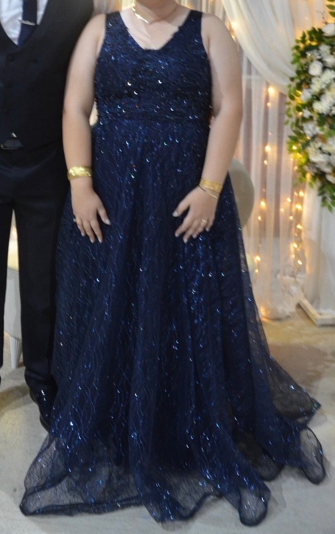 Parıltılı lacivert kumaştan, V yakalı ve askılı uzun, vücuda oturan nişan elbisesi. Nişanımda giymiştim sadece. Fakat nişanda oynarken biri eteğime basmıştı sadece kuyruk tarafında bir yırtılma var. Onun dışında tamamen temiz bir şekilde kılıfında durmaktadır. İzmirde bir mağazadan almıştım. Alırken 11.000 TL ye aldım. ✨