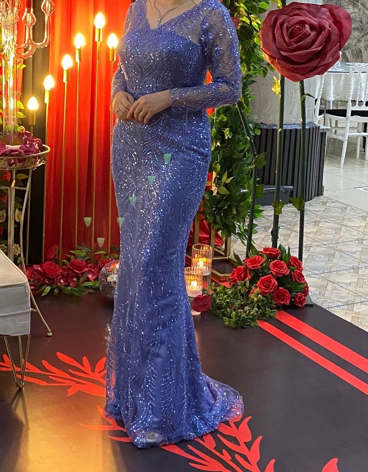 Parıltılı desenli, V yakalı ve uzun kollu, klasik şıklıkta mavi uzun abiye elbise.