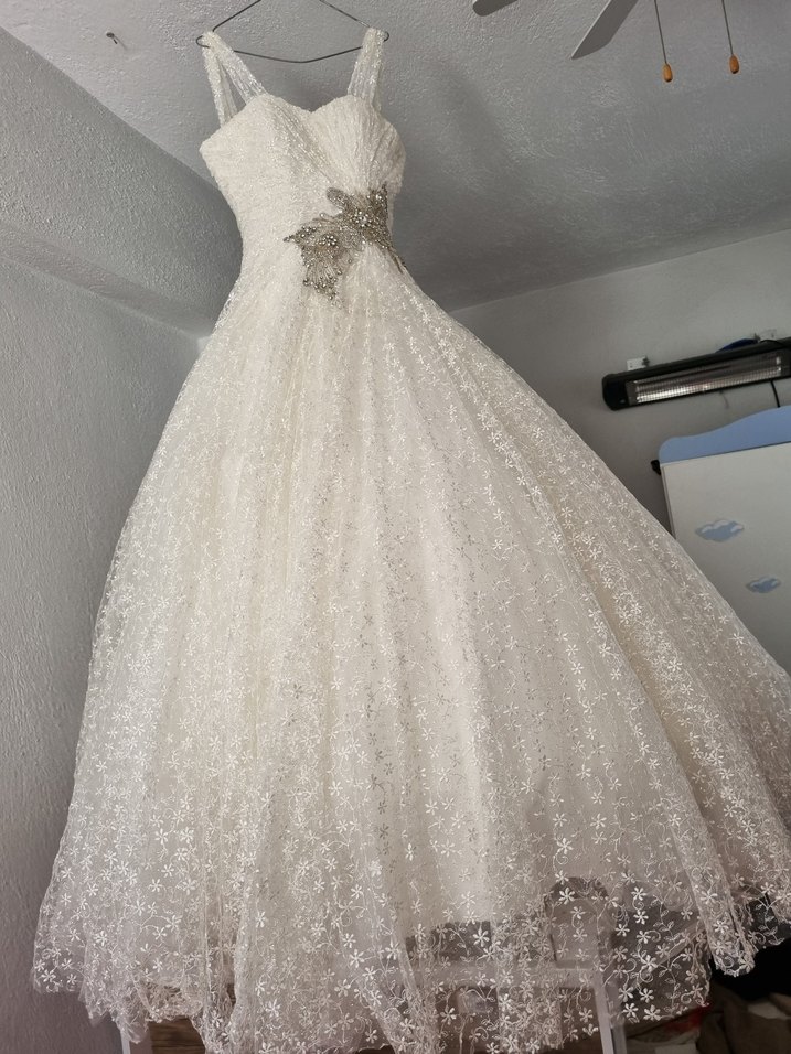 Bu uzun beyaz gelinlik, straplez yaka ve askılı kol detaylarına sahiptir. Vintage esintili, parıltılı ve çiçek desenli, belinde süslemeli klasik prenses kesimdir.