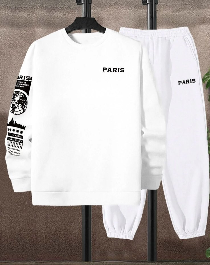Beyaz, uzun kollu, bol kesim erkek sweatshirt, Paris temalı baskılar ve yuvarlak yaka ile. Yumuşak ve sıcak kumaştan üretilmiştir.