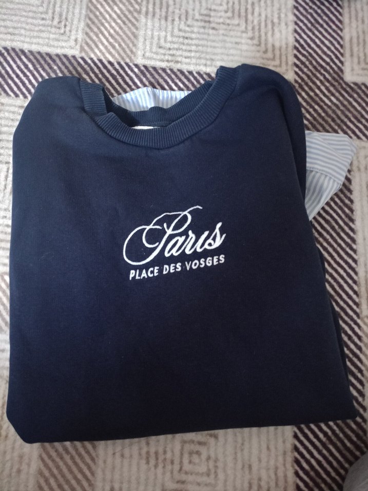 Lacivert renkli, yuvarlak yakalı ve uzun kollu kadın sweatshirtü. Rahat kesimi ve "Paris PLACE DES VOSGES" nakışı ile gündelik kullanıma uygundur.