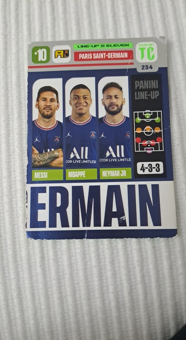 Messi, Mbappe ve Neymar Jr. görselleriyle 4-3-3 dizilişli koyu mavi Paris Saint-Germain futbol rozeti. ⚽