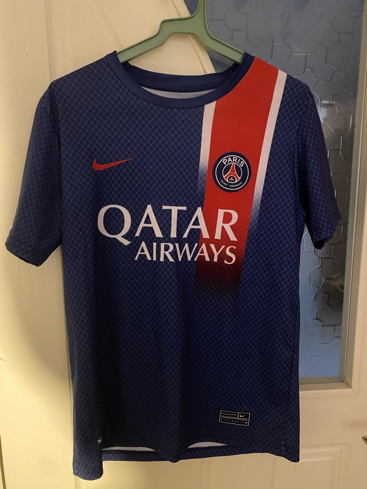 Lacivert renkli, yuvarlak yaka ve kısa kollu Mbappe forması bol kesim ve drapeli tasarıma sahip, Paris Saint-Germain logosu ve 'Qatar Airways' baskılı.Fotoğrafa gösterdiğim gibi çok minik kusurları var onun dışında tertemiz.
