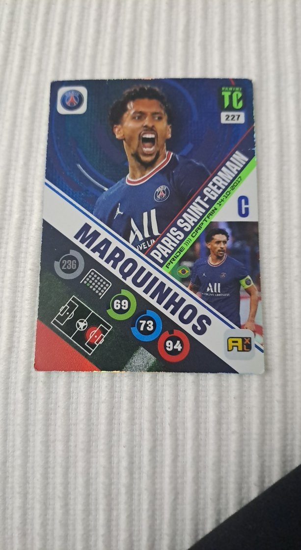 Koyu mavi Paris Saint-Germain rozeti, futbolcu Marquinhos ve istatistikleriyle. Pop kültür ve athleisure tarzında. ⚽