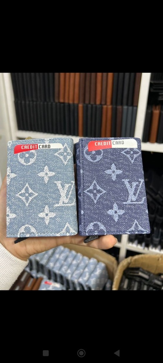Parisian desenli erkek cüzdanları, mavi ve gri renklerde, trend sokak stiliyle. Kredi kartı bölmeleri bulunur.