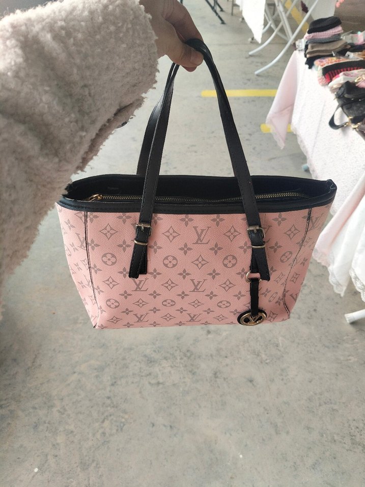 Pastel pembe deri çanta, baskılı deseni ve tokalı siyah saplarıyla Parisian tarzını yansıtır. Günlük kullanıma uygundur.