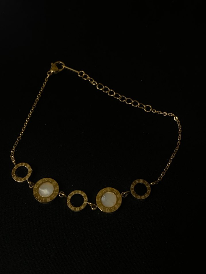 Klasik Parisian gotik tarzında, zincir detaylı ve inci görünümlü dairesel süslemelere sahip altın bileklik. ✨