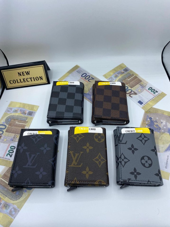 Ekose desenli, koyu gri Parisian tarzı erkek cüzdanı. 'NEW COLLECTION' etiketiyle trend belirleyicilere uygun.