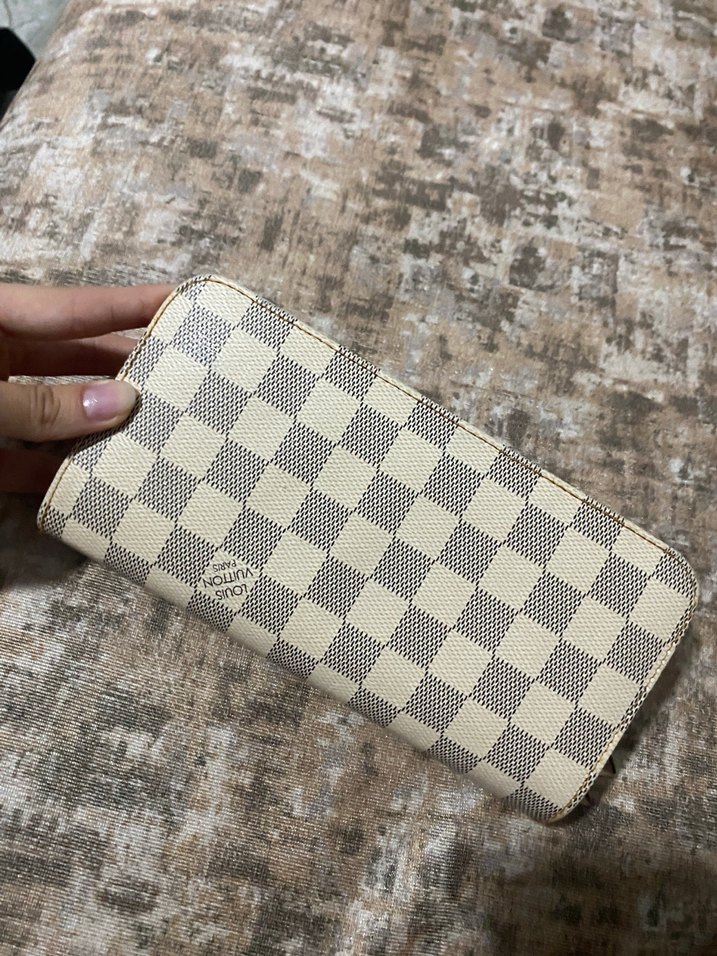 Beyaz deri kareli desenli, fermuarlı, Parisli modern klasik tarzda günlük kullanıma uygun cüzdan.