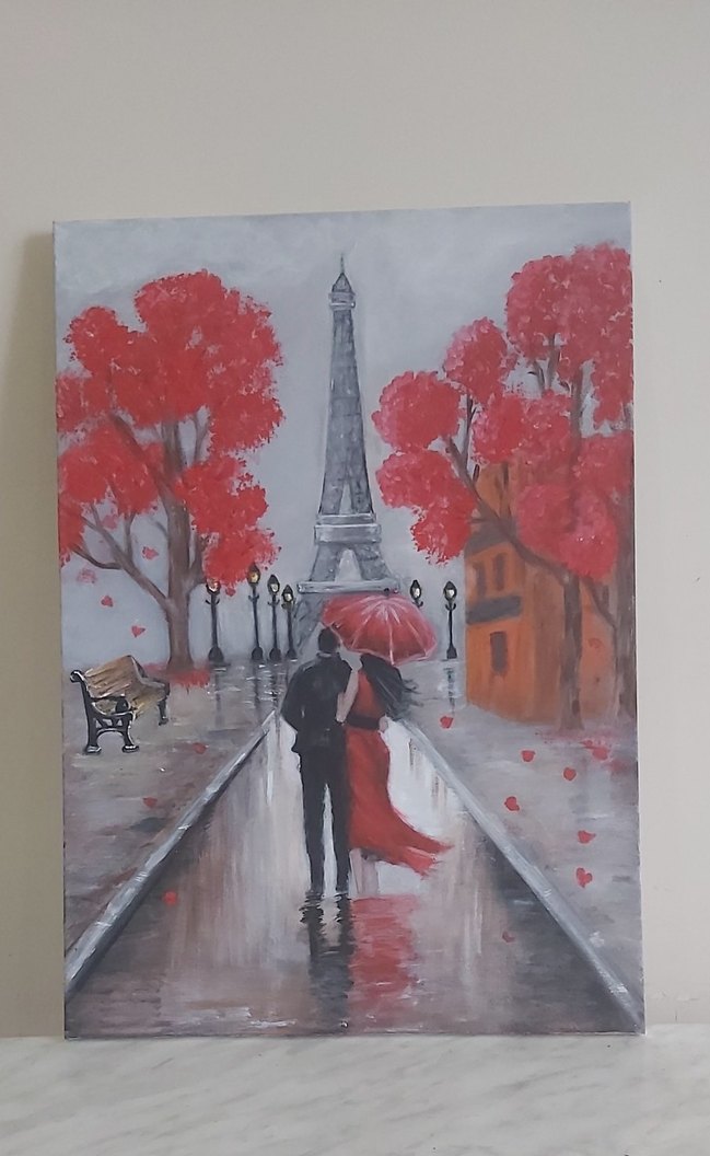 sevgililer gunune ozel ...Tabloda, parlak kırmızı ağaçların olduğu yağmurlu bir sokakta kırmızı şemsiye altında yürüyen bir çift ve arka planda Eyfel Kulesi yer alıyor. ️