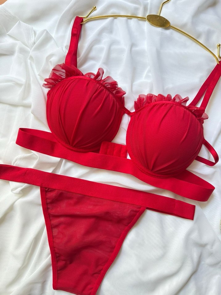 Parizyen tarzı, canlı kırmızı renkte sütyen takımı. Fırfırlı detaylar ve desensiz tasarımıyla bohem havası taşıyor.
