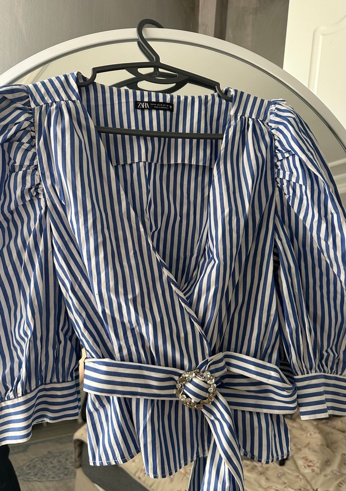 Bu dar kesim kadın gömlek, askılı kollara ve tokalı bel kemerine sahiptir. Mavi beyaz çizgili deseni ve V yakası ile parlak bir görünüme sahiptir, trend sokak modasına uygundur.
