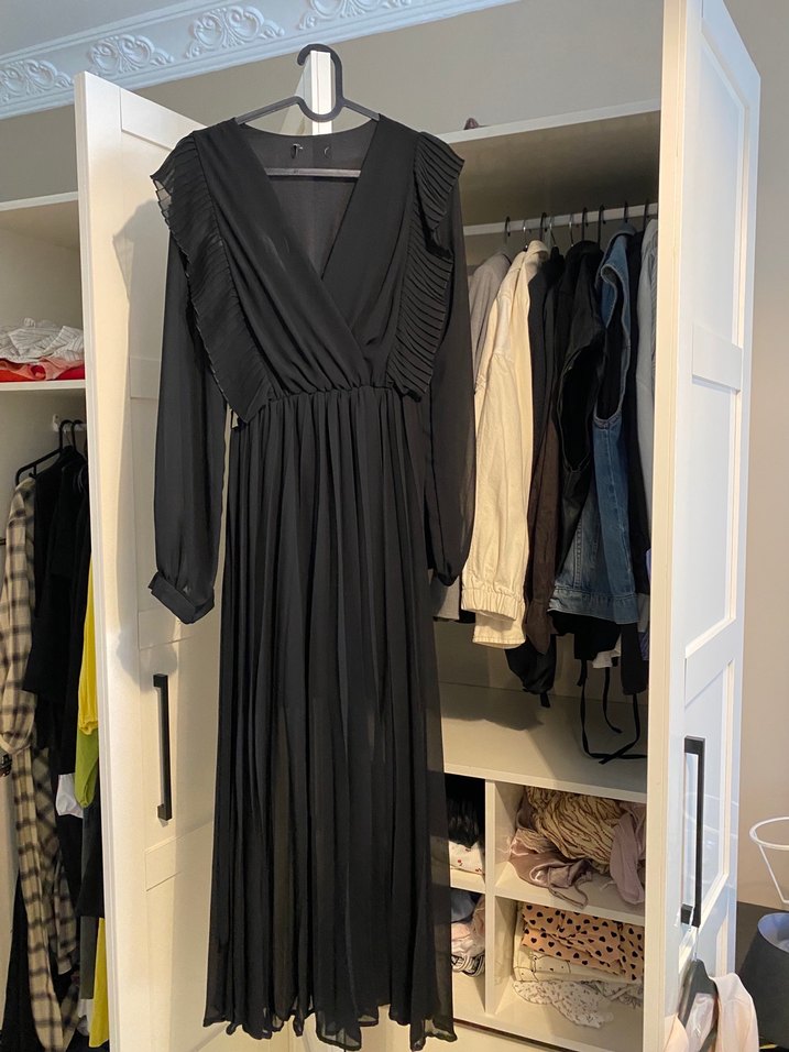 Siyah uzun elbise, piliseli detaylı, V yaka ve uzun kolludur. Yumuşak sentetik kumaştan, bol kesim ve klasik gotik Parizyen stilindedir.