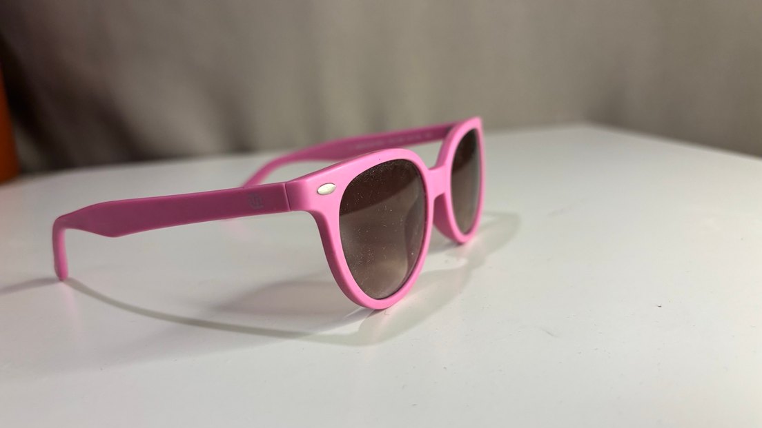 Parlak pembe renkte, renkli ve retro Parizyen tarzında kız çocuk güneş gözlüğü.