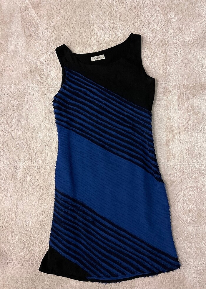 Kolsuz, diz hizası, siyah ve saks mavi, kesim ve iplik detaylı, çok şık bir iş elbisesi. Davet ve özel günler için de uygun. Az kullanıldı, çok iyi durumda.