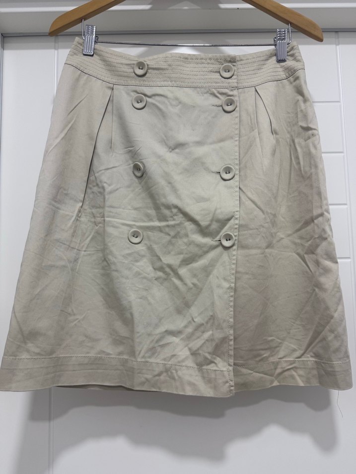 Bej renkli, düğmeli önüyle ve regular fit kesimiyle hamile eteği. Yumuşak keten kumaştan, desen içermeyen sade tasarım. Midi boyu, ofis ve sokak stiline uygun.