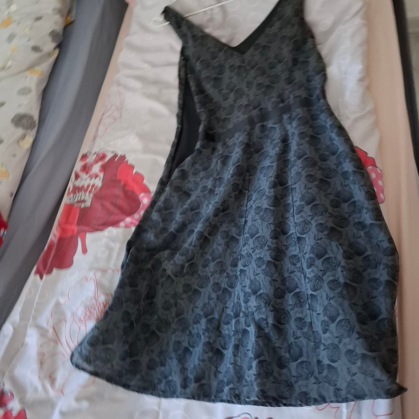 Gri renkte, V yakalı, kolsuz midi. İnce dokulu sentetik kumaştan, drapeli ve vintage gotik deseniyle özel gün ve gecelerde uygun.