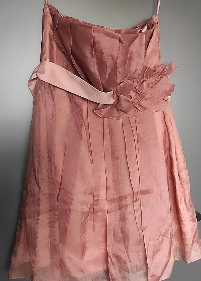 Özel ürün etiketlidir. Çok beğenerek aldım ama hiç giyemedim. Soğan kabuğu rengindedir. Astarlı organze kumaştır. Çıkarılabilir kemeri var. Kusuru defosu yoktur.