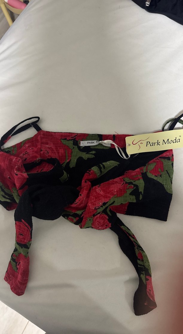 Park Moda markalı, baskılı, kırmızı mini büstiyer. Sokak modası ve grunge punk tarzını yansıtan kısa kesim ve ayarlanabilir askılar içerir.