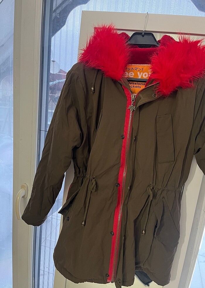 dışı haki ici kırmızı peluş parka japonya’dan alındı en 57 boy 70