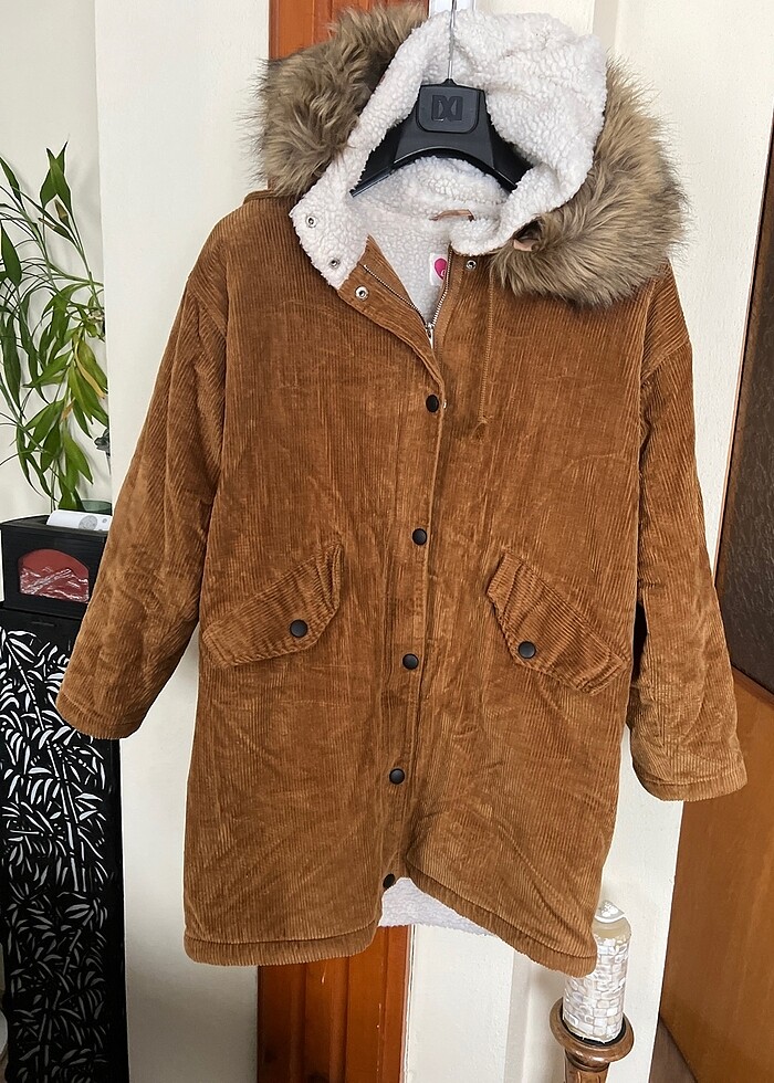 Kürklü kapişonlu kalın fitilli kaban iki koltuk altı arası 58 cm boy uzunluğu 85 cm