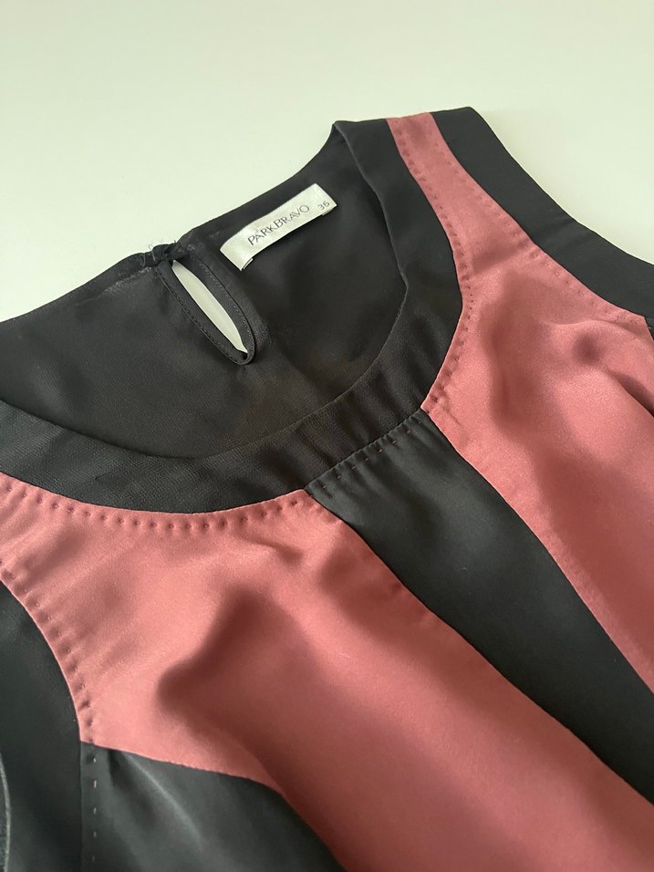 Kaliteli saten kumaştan yapılmış, yandan fermuar detaylı, mürdüm-siyah renkte normal uzunlukta, kolsuz midi elbise. 1-2 kez giyildi, çok iyi durumdadır. İçi astarlıdır. Özel kesimi ve kumaşının deseni sayesinde 1 beden zayıf gösterir.