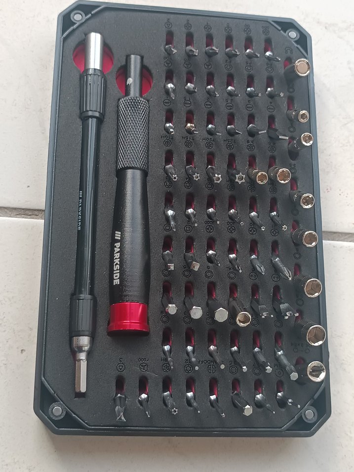 Parkside markalı, çeşitli bilgisayar bileşenleri için uygun çoklu tornavida uçları, sap ve uzatma parçası içeren set.
