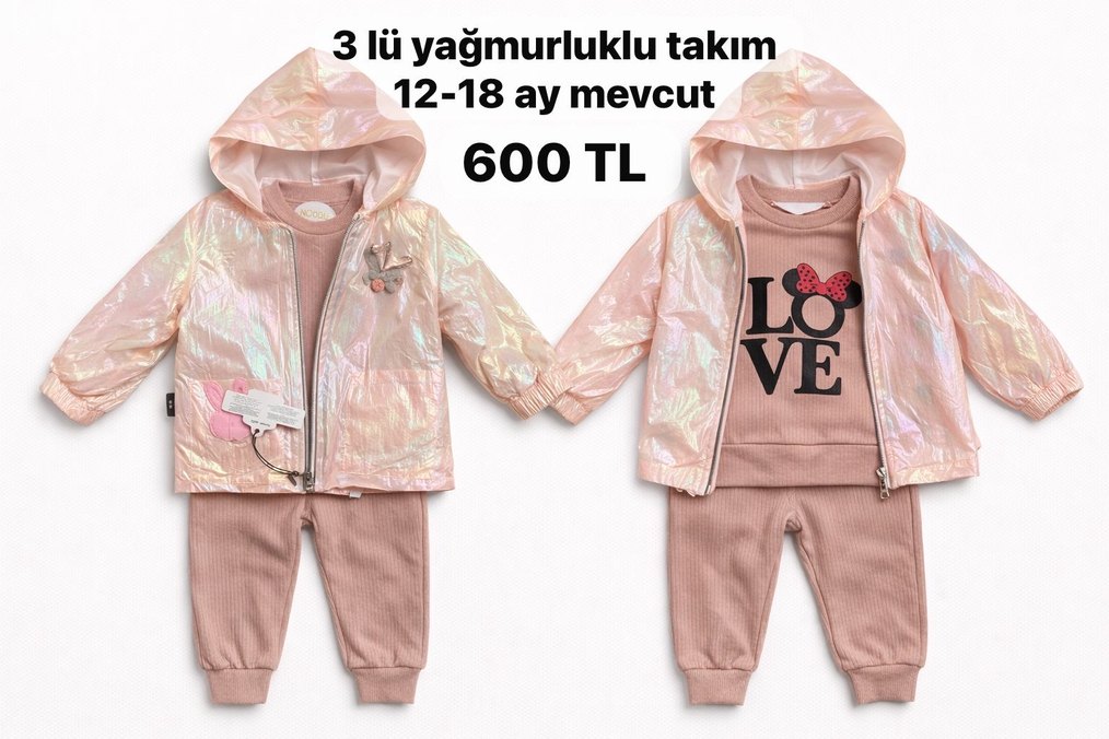 Pastel pembe, parlak yağmurluklu, uzun kollu baskılı üst ve pantolondan oluşan 3'lü bebek takımı, 12-18 ay için uygundur.