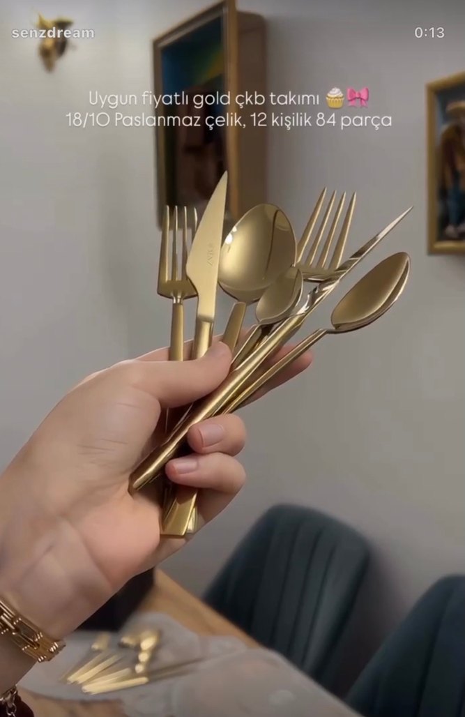 Parlak altın renkte, 18/10 paslanmaz çelikten üretilmiş 12 kişilik, 84 parçalık çatal, bıçak, kaşık takımı.