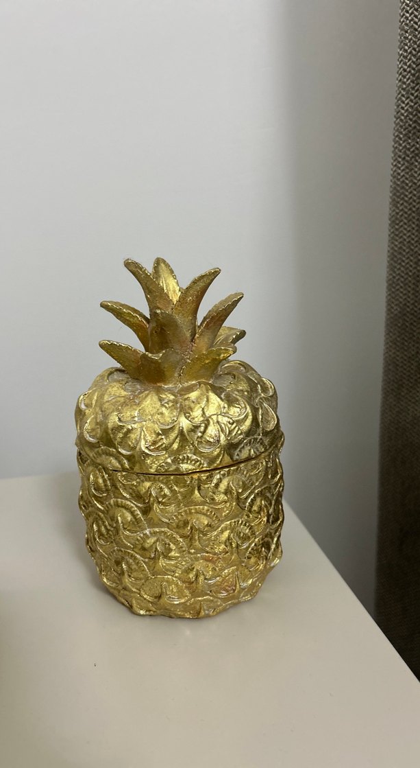 Parlak altın renginde, detaylı dokulu ve kapağı açılabilen ananas figür biblo.