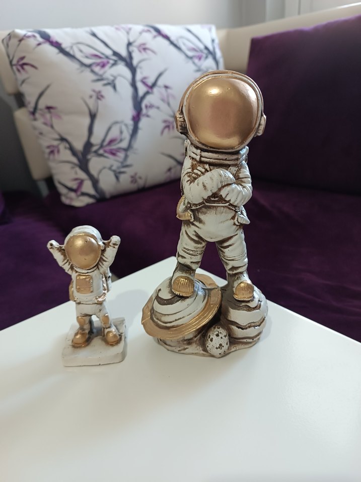 Parlak altın renkte, detaylı astronot figürleri. Uzay temasını yansıtan dekoratif ürünler.