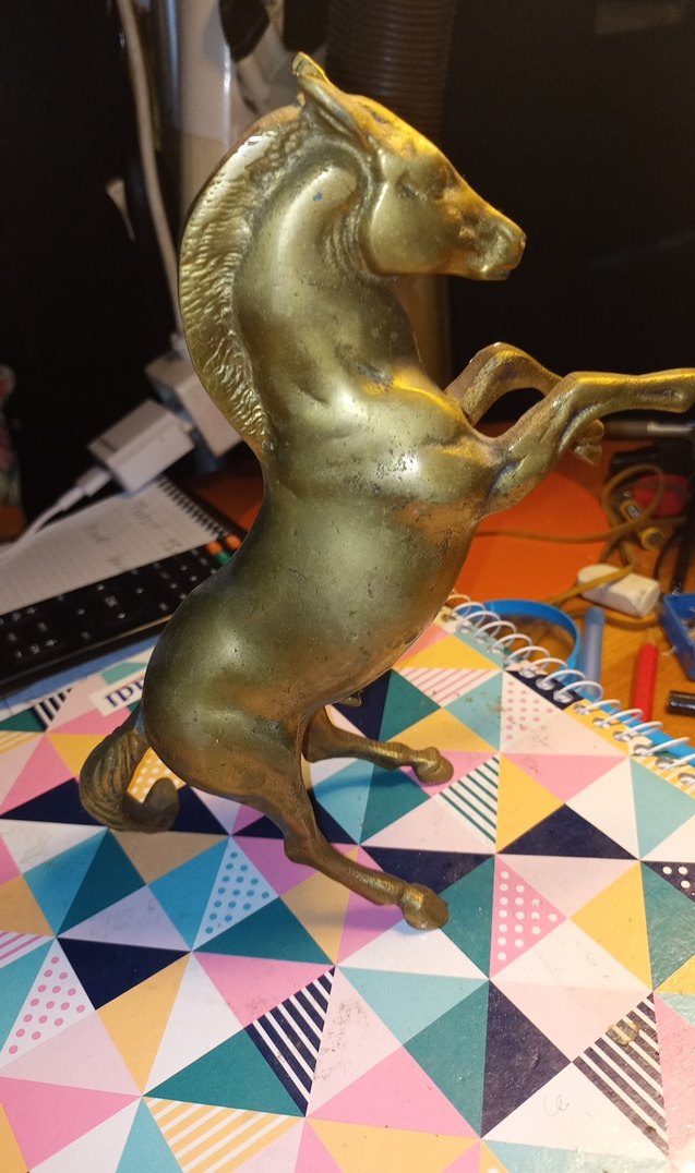 Parlak altın renkte, detaylı işçilikle yapılmış ve pürüzsüz yüzeye sahip ayakta duran at figürü.