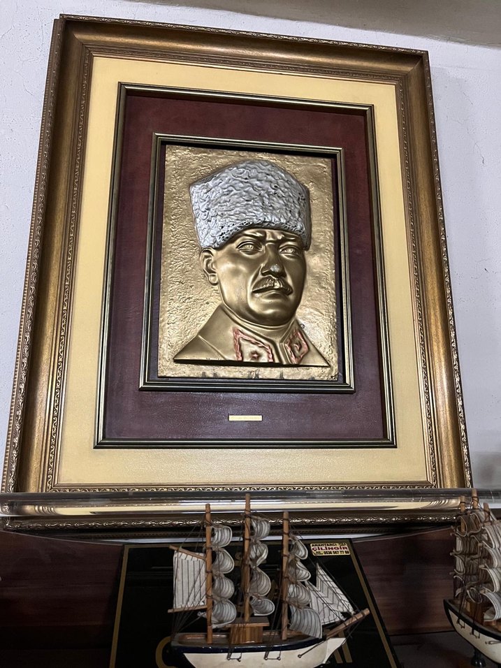 Parlak altın renkte Atatürk rölyefi içeren detaylı çerçeveli dekoratif tablo. Bazı çizilmeler var altın tekli alıp kapatabilirsiniz
