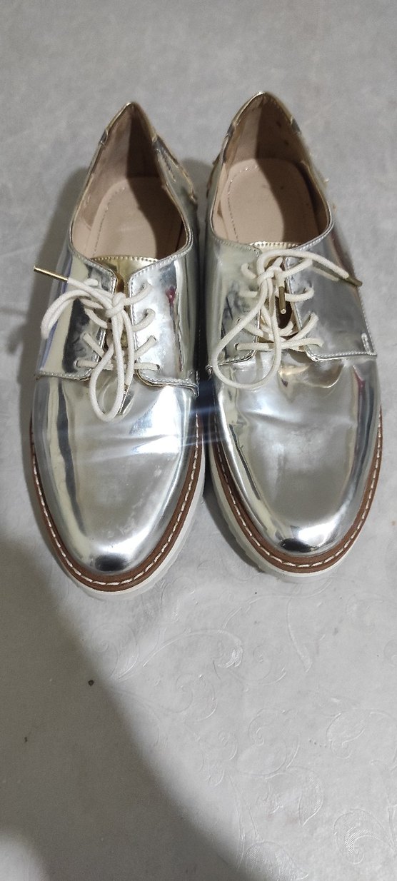 Parlak altın renkli, bağcıklı ve ince topuklu kadın klasik ayakkabısı. Metal malzemeden olup gündelik şık Paris tarzına uygundur.