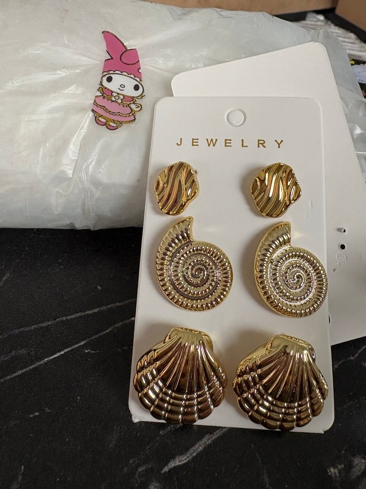 Parlak altın renkli, desenli ve payet detaylı kısa bohem küpe seti, günlük kullanım için uygun.