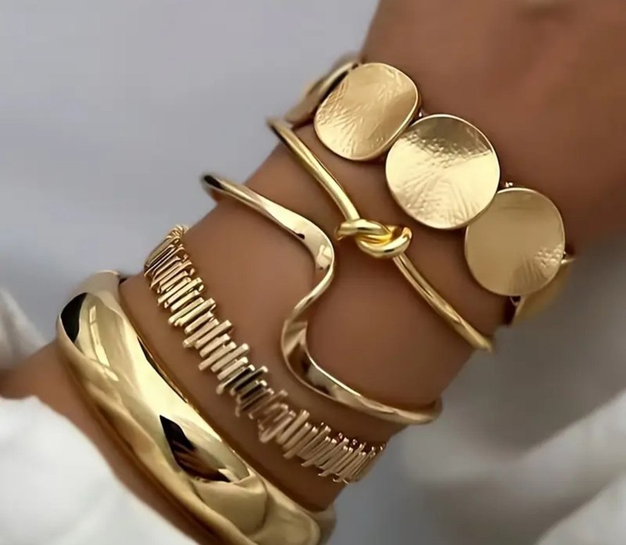 Parlak altın renkli, yılan desenli ve tokalı detaylara sahip bohem tarz bilezikler, günlük kullanıma uygun. ✨ 5 parça şık bileklik