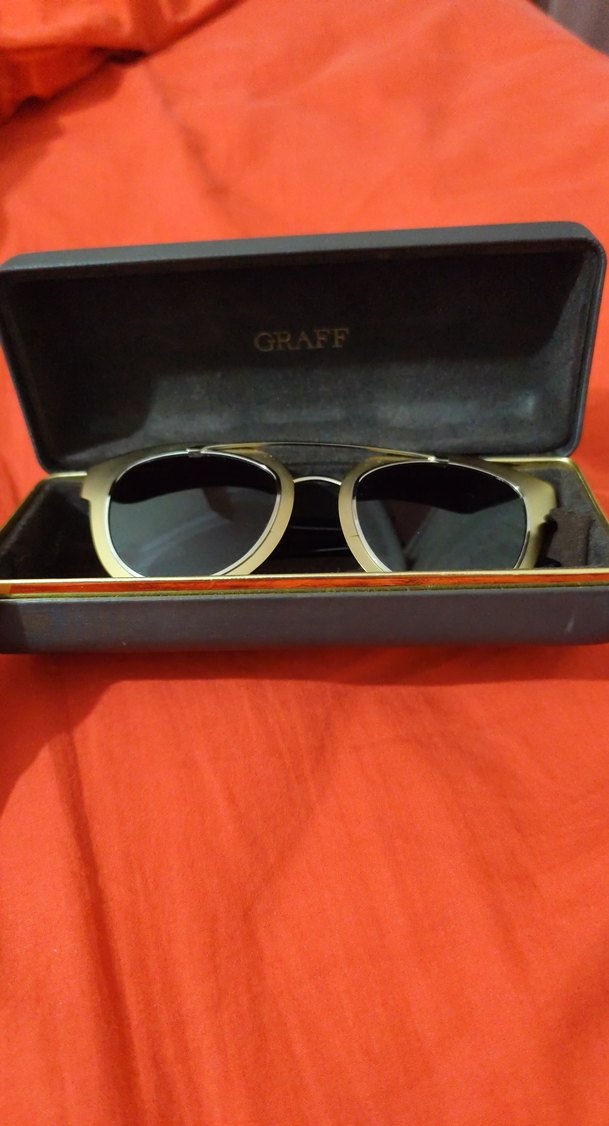 Parlak altın çerçeveli, gri camlı kadın gözlüğü. Klasik ve karşı kültür tarzını birleştirir. Kutusunda GRAFE markası bulunur.