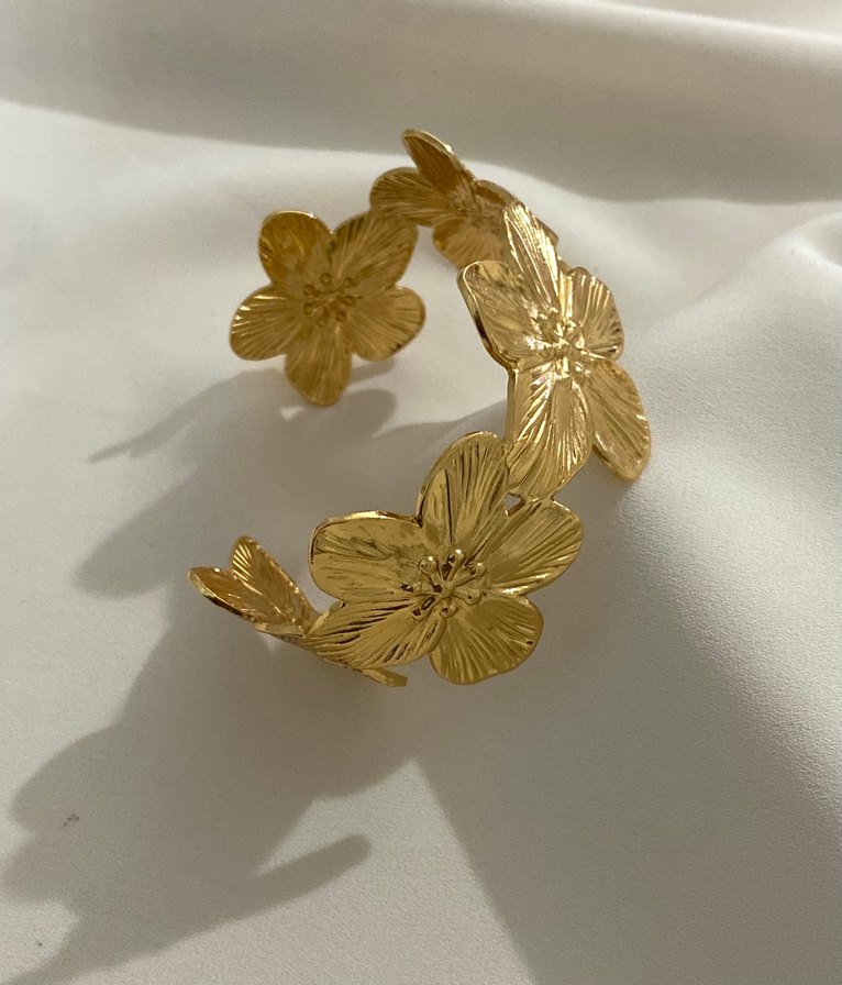 Parlak altın renkli, çiçek desenli ve tokalı bohem tarzda bilezik. Düğün gibi özel anlar için uygun.