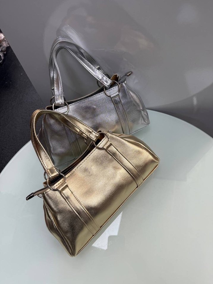 Parlak altın deri kadın çanta, tokalı detaylı ve çağdaş tarzda. Düz yüzeyi günlük kullanım için uygundur.