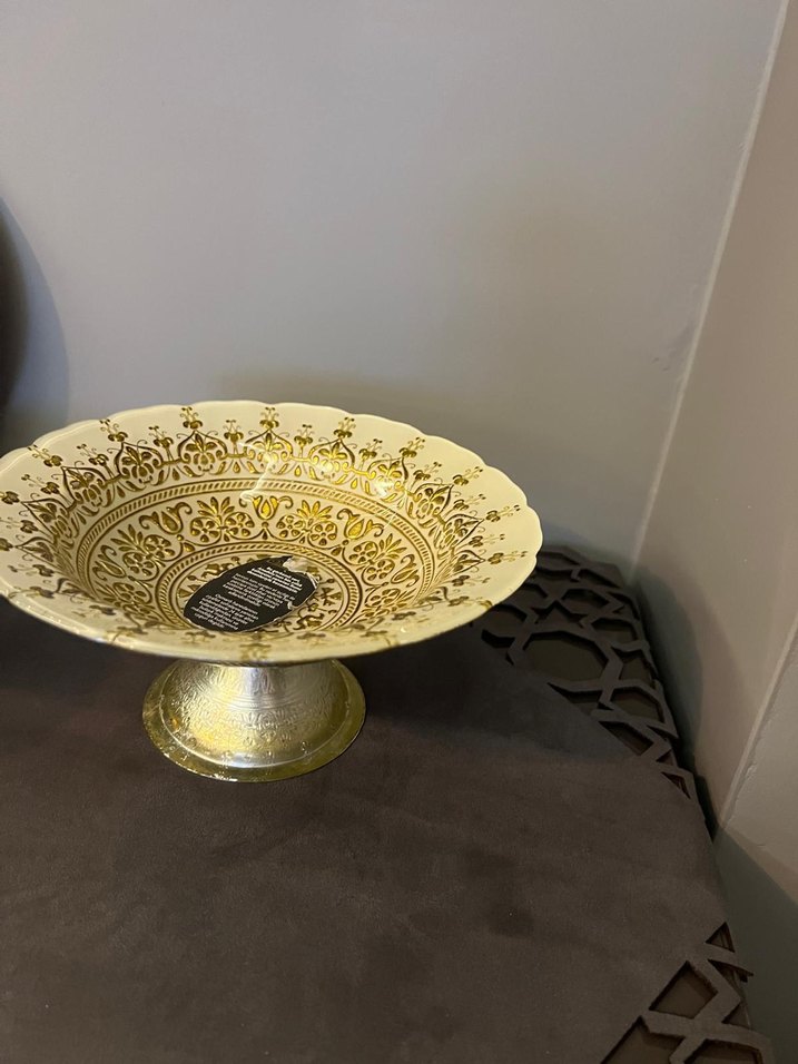 Parlak altın renginde, bronz deseniyle süslenmiş klasik ayaklı tabak, masanıza şık bir dokunuş katar.