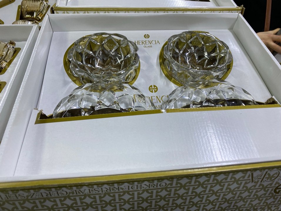 Herencia markalı, parlak altın detaylı şeffaf cam kaselerden oluşan set. Servis veya dekorasyon için uygun. ️hem ayaklı ıkı adet hem düz ıkı adet toplamda 4 adet vardır ıcnde