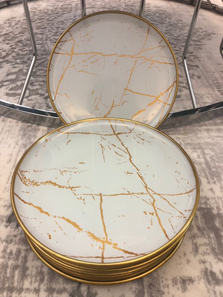 Yuvarlak, parlak altın mermer desenli ve altın kenarlı yemek tabakları seti. ️