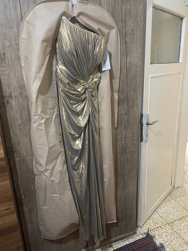 Parlak altın renkte, straplez ve drapeli uzun abiye elbise. Fitted kesim, çağdaş stil ve kolsuz tasarım ile düğünler için ideal. Avant-garde moda tutkunlarına uygun. ✨