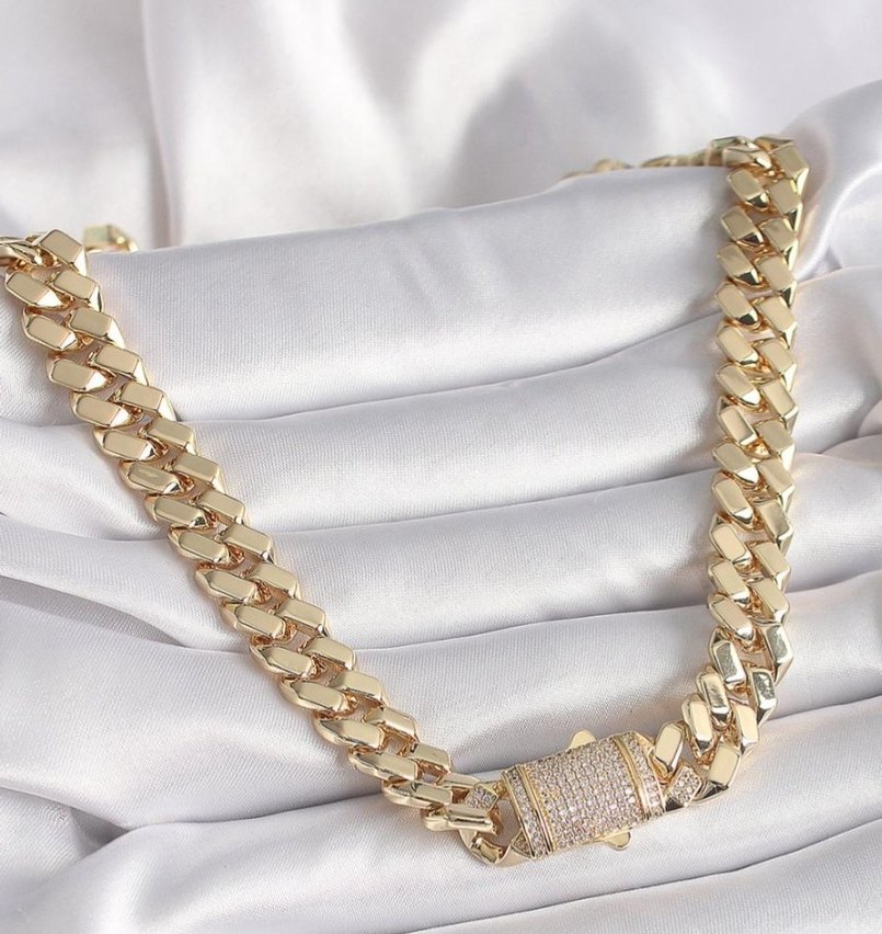 Parlak altın zincirden yapılan erkek kolye, iddialı ve gösterişli sokak stili sunar. Kilit kısmı küçük parlak detaylarla süslenmiştir. ✨