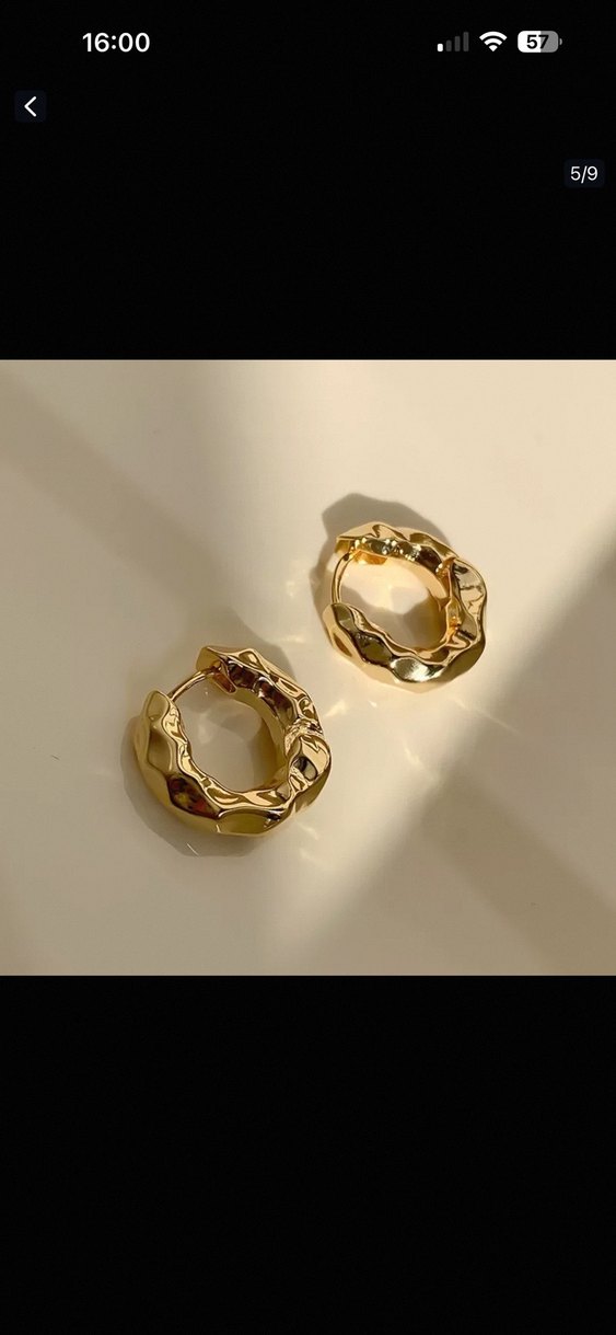 Parlak altın midi küpeler, geometrik desenli ve tokalı tasarıma sahip, romantik akşamlar için klasik şıklık sunar.