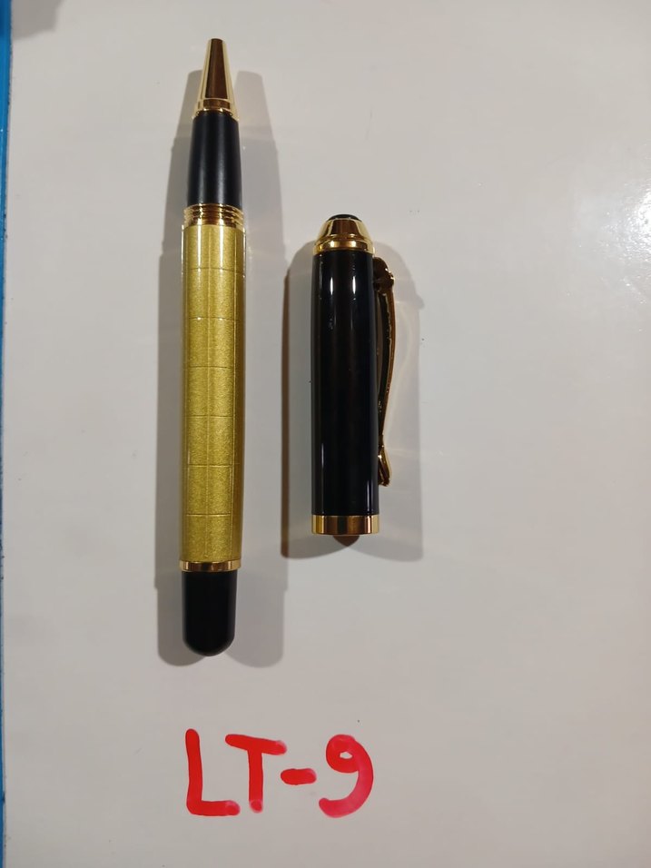 parlak altın renkli gövde ve siyah detaylara sahip, kapaklı tükenmez kalemdir. ️