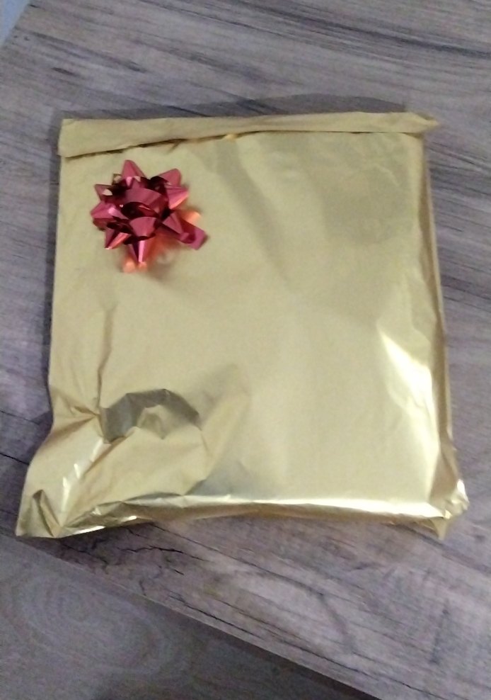 Parlak altın renkli kağıda sarılmış, üzerinde kırmızı süsleme fiyonk bulunan paketiyle hediyelik defter
