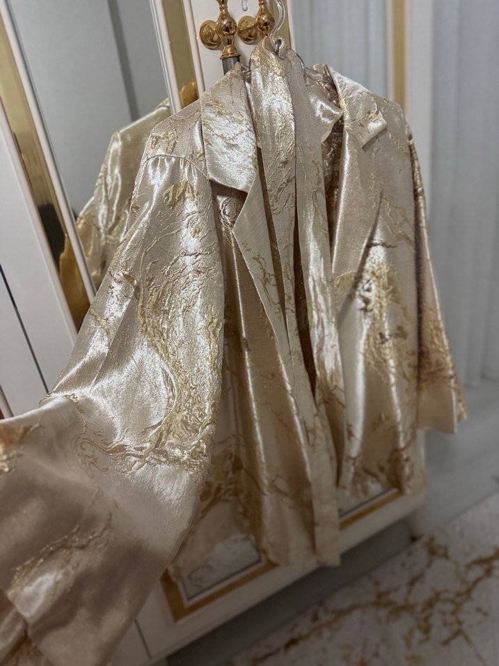 Parlak altın renginde, işlemeli detaylara sahip uzun kadın sabahlığı. Regular kesim ve ince askılı kollara sahip, bohem Paris tarzı. ✨